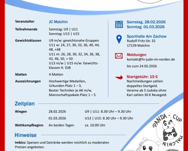 Willkommen auf der Homepage vom JC Malchin. Hier findest du die aktuellen Ausschreibungen und Termine, unsere jüngsten Erfolge im Blog, die schönsten Bilder unserer Judokas und vieles mehr.